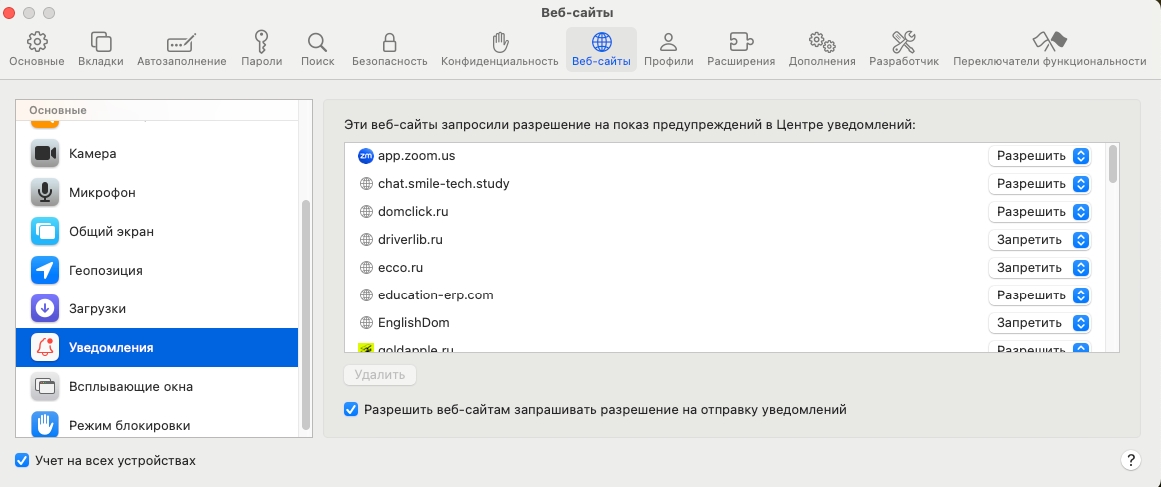 Выберите параметры, которые будут действовать по умолчанию, а также добавьте сайты, с которых будут приходить уведомления на устройство.