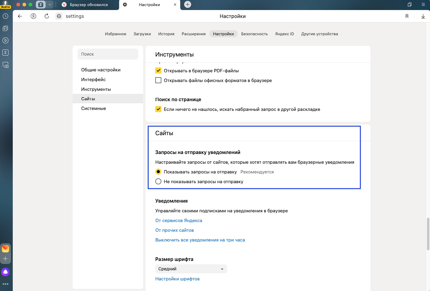 В блоке Стиль уведомлений настройте уведомления для браузера.