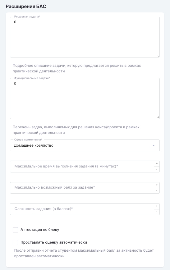 Если в программе какое-либо расширение не применимо, то на странице редактирования активности можно указать "Нет данных", либо 0 (в зависимости от того, числовое это поле или текстовое).