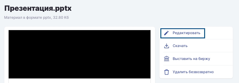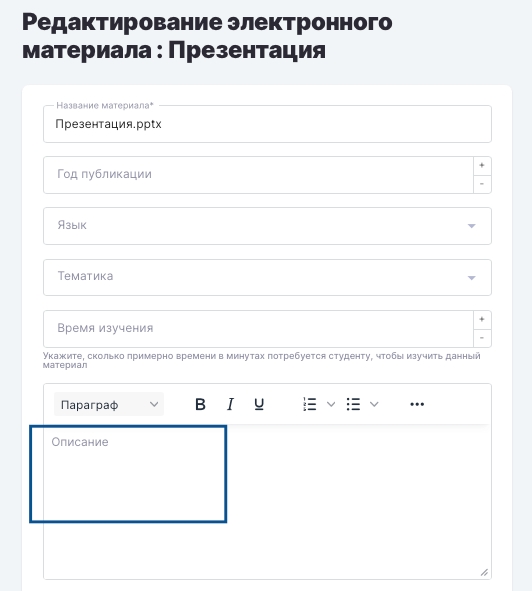 Любой материал, добавляемый на платформу (видеоматериалы, презентации и т.д.), должен соответствовать требованиям У2035 и иметь описание. Описание добавляется не сразу при загрузке, а уже далее на странице редактирования материала в поле "Описание".
