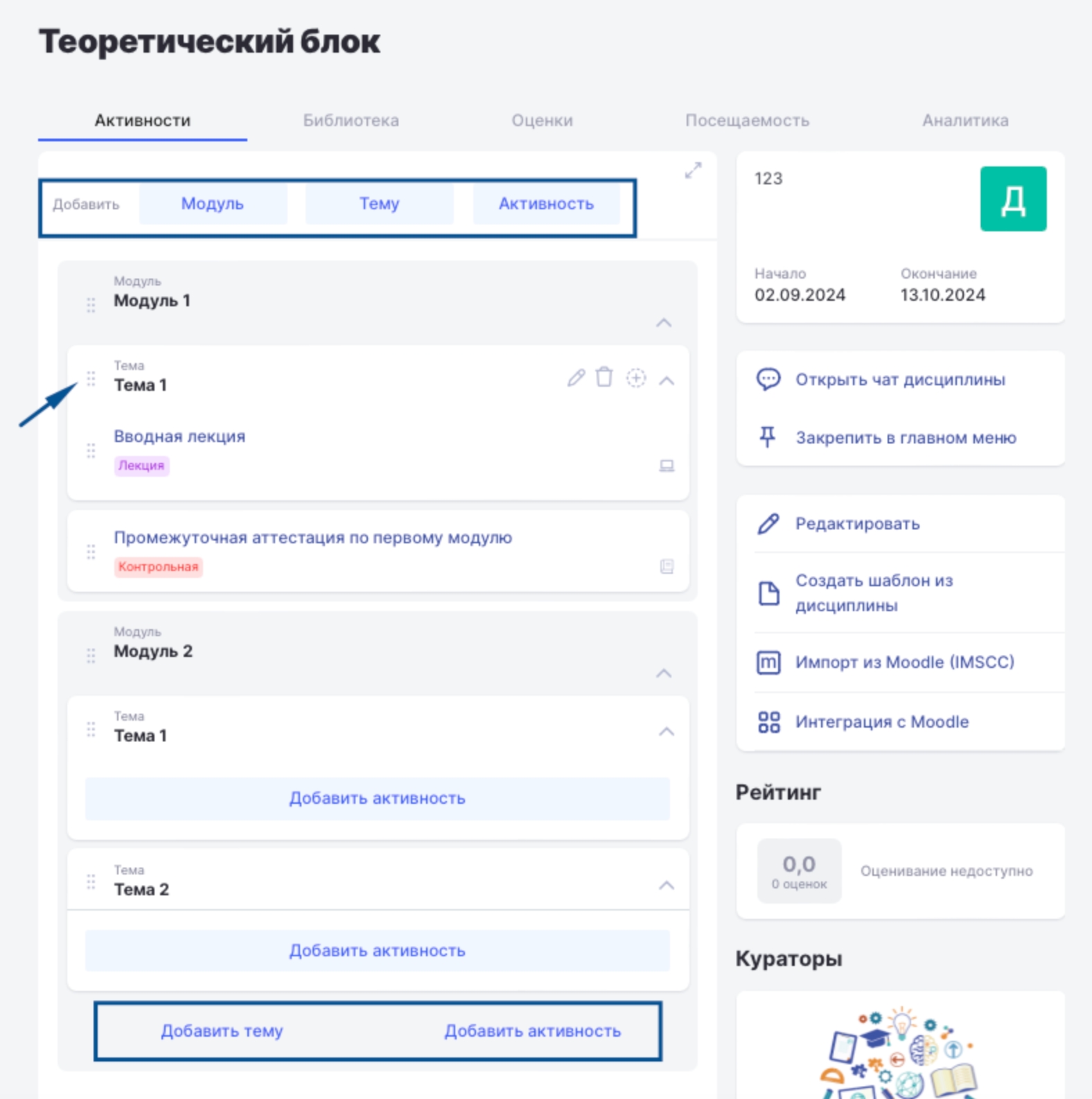 Образовательные активности в Odin могут быть различных типов: лекция, задание, самостоятельная работа, контрольная и т.д. Все активности добавляются через страницу блока (дисциплины).